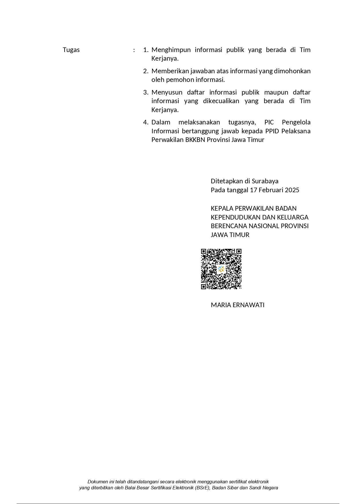 Sesuai dengan Peraturan Badan Kependudukan Nomor 4 Tahun 2022 tentang Penyeleggaraan Layanan Informasi Publik di BKKBN, pada Perwakilan BKKBN Jawa Timur telah dibentuk PPID Pelaksana dengan Surat Keputusan Kepala Perwakilan BKKBN Jawa Timur No: 2634/HK.02.02/J/2025 Tanggal 17 Februari 2025 Tentang Pejabat Pengelola Informasi dan Dokumentasi Perwakilan BKKBN Jawa Timur.